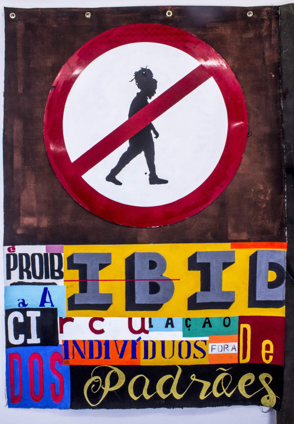 The work that lends its name to the show is a good clue to the understanding of the whole. In it, the artist portrays himself with his back to a human scale, positioned in a framed situation. It is not given to the observer to see his face: when we come into contact with the work, we are displaced to momentarily occupy the place of the police at the moment of the approach, looking at him as a public security agent would see him. We are, in this way, as if summoned to understand ourselves as co-responsible for the scene that is set before us - violent, but absolutely mundane for "non-standard individuals" such as the artist: black, young, marginalised.
